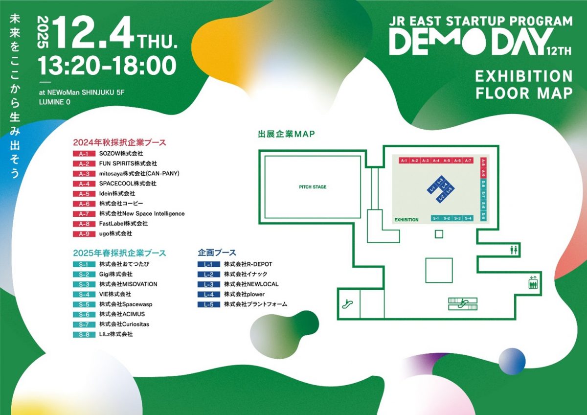 - 12回目となる今回は、これまでのプログラム採択企業や2025春プログラムの採択企業が集まるリアルイベント「第12回JR東日本スタートアッププログラムDEMODAY」を12月4日(木)にJR新宿駅LUMINE0<ルミネゼロ>で開催します。